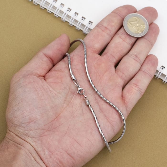 Цепочка с плетением «снейк» из нержавеющей стали — это изысканное и практичное украшение, отличающееся гладкой, плотной текстурой и гибкой структурой. Плетение в форме «змейки» придаёт изделию утончённый блеск и современный вид. Застёжка карабин-лобстер обеспечивает удобное и надёжное крепление.