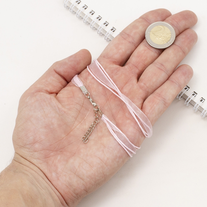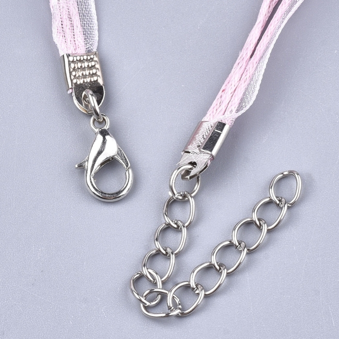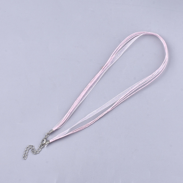 Основа для Ожерелья из 2 Хлопковых Шнуров и Ленты Органзы с Застежкой Карабин-лобстер и цепочкой. Цвет: Розовый.