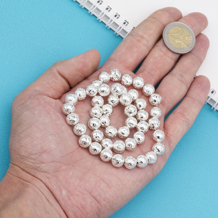 Бусины Натуральная Лава, На нитях, Круглый, Гальваника, Диаметр: 8-8.5мм, Отверстие: 1мм, Цвет: Серебристый, около 45шт/38см/нить, (УТ100028679) - ᐈ заказывайте в Москве оптом и в розницу ✅Скидки ✅Акции ✅Распродажи ᐈ доставка по всей России ᐈ Интернет-магазин Мир Бусин