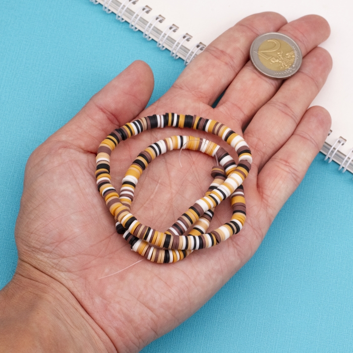 Плоские круглые бусины heishi ручной работы из полимерной глины - это отличный выбор для создания легких, летних или пляжных украшений, а также для детской бижутерии. Они могут быть использованы для создания ожерелий, браслетов, сережек и других украшений, добавив вашему образу нотку непринужденности и веселья. Эти бусины также можно комбинировать с металлическими украшениями и жемчугом, создавая уникальные комбинации. Хотя бусины могут немного отличаться по форме и размеру, именно это делает каждое изделие уникальным и особенным.
