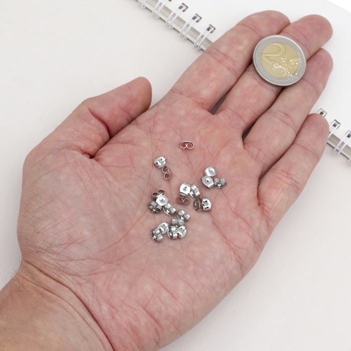 Заглушки для серёг-гвоздиков (пусетов), изготовленные из медицинской стали, являются незаменимым элементом для фиксации украшений. Благодаря материалу, они гипоаллергенны, устойчивы к коррозии и долговечны. Заглушки имеют стальной цвет, который сохраняет свой блеск и не тускнеет со временем.