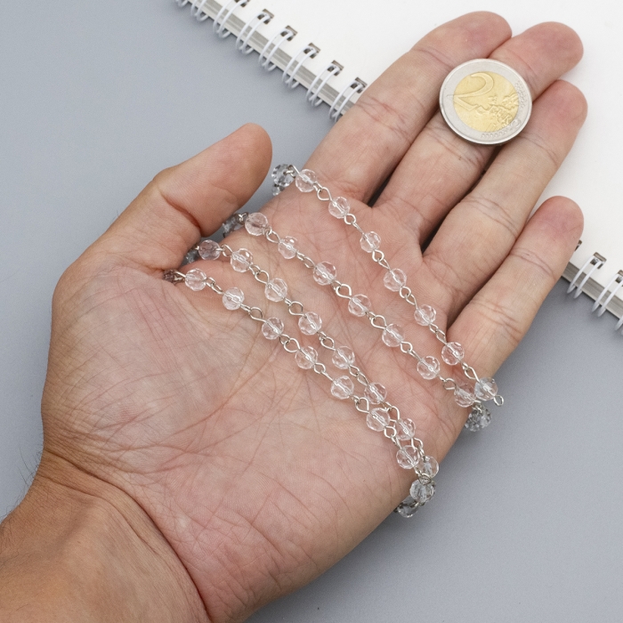 Цепь ручной работы с гранеными стеклянными бусинами. Подходит для изготовления браслетов, ожерелий, модных и стильных ожерелий для очков. Они также могут использоваться в качестве отдельного элемента в декоре и оформлении, универсальны в воплощении ваших творческих идей. С ней легко работать, отлично раскрываются звенья, вы с легкостью регулируете нужную длину.