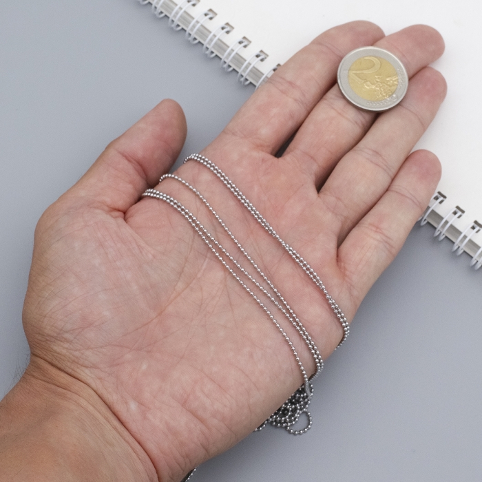 Цепь отлично подходит для создания украшений — ожерелий, браслетов, брелоков и других аксессуаров. Её можно использовать как самостоятельный элемент или дополнять подвесками, бусинами и фурнитурой. Для фиксации концов необходимы специальные застёжки для шариковых цепочек. Благодаря благородному металлическому блеску и прочной основе, она подойдёт как для повседневных украшений, так и для дизайнерских проектов.
