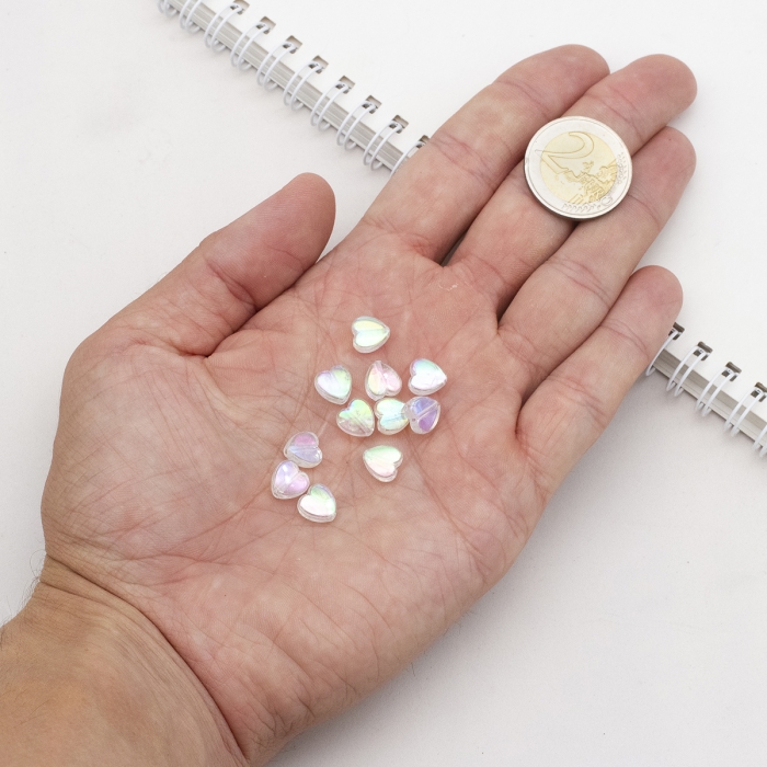 Прозрачные акриловые бусины в форме сердечек с АВ-покрытием (Aurora Borealis) эффектно переливаются радужными оттенками при попадании света, придавая украшениям яркий и волшебный вид. Лёгкий и прочный материал делает их удобными в работе и долговечными в использовании.