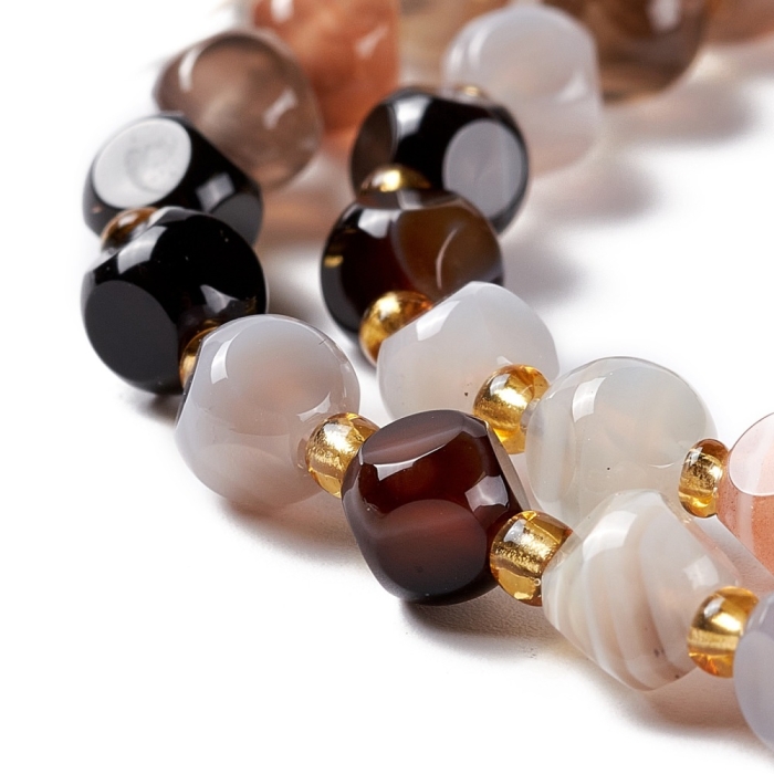Считается, что агат способствует стабильности, равновесию и ясности во всех сферах жизни. Его энергетические балансирующие свойства помогают регулировать потоки энергии в организме, способствуя общему здоровью и благополучию. Его часто используют в медитации и других духовных практиках, поскольку он помогает успокоить ум и способствует внутреннему умиротворению. Считается, что он также повышает мужество владельца, улучшает восприятие и концентрацию, защищает от опасностей.