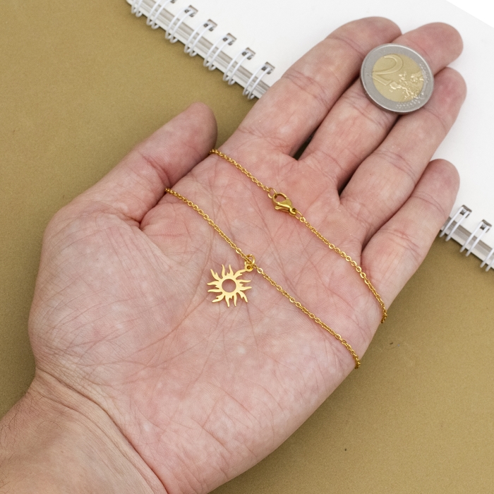 Изящное ожерелье с подвеской в форме солнца — это стильный и символичный аксессуар, выполненный из нержавеющей стали с износостойким золотистым покрытием. Лаконичная цепочка и выразительный кулон с лучами делают украшение ярким акцентом в образе. Нержавеющая сталь гарантирует долговечность, устойчивость к коррозии и комфорт при носке, даже для чувствительной кожи.