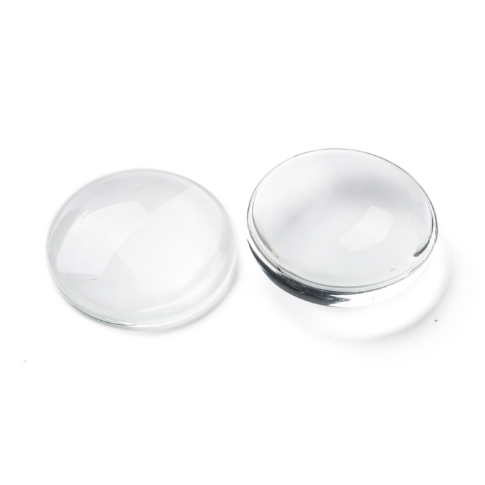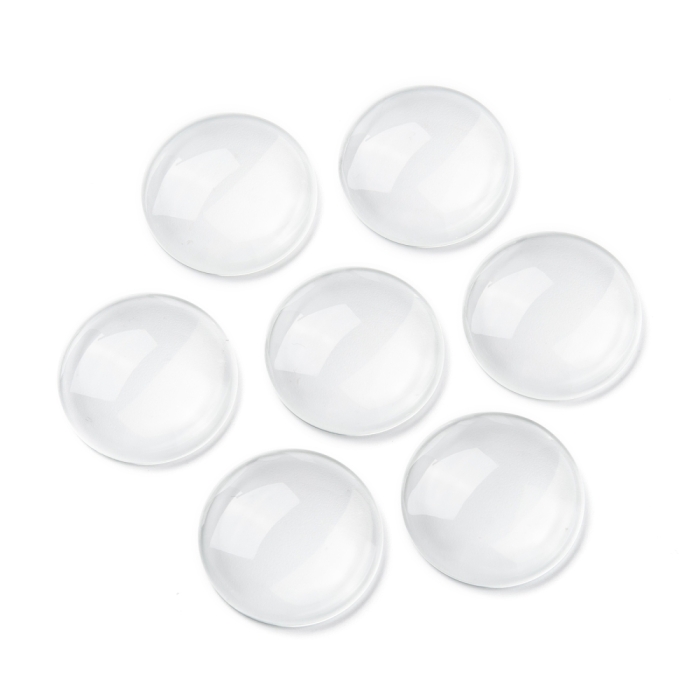 Круглые стеклянные кабошоны — это универсальные элементы для декорирования, отличающиеся гладкой поверхностью и эффектом объема. Они изготовлены из высококачественного стекла, что придаёт им прозрачность и блеск, усиливающий глубину цвета и рисунка основы, с которой они используются. Полукруглая форма придает кабошонам выпуклость, позволяя фокусировать свет и создавать визуальный эффект увеличения изображения под стеклом.