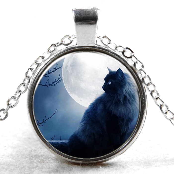 Винтажный Кулон Кот Круглый на Цепочке, Металл и Стекло, Цвет: Серебро, Размер Цепочки: Длина 45-50см, Кулон: внешний диаметр 27мм, внутренний диаметр 25мм