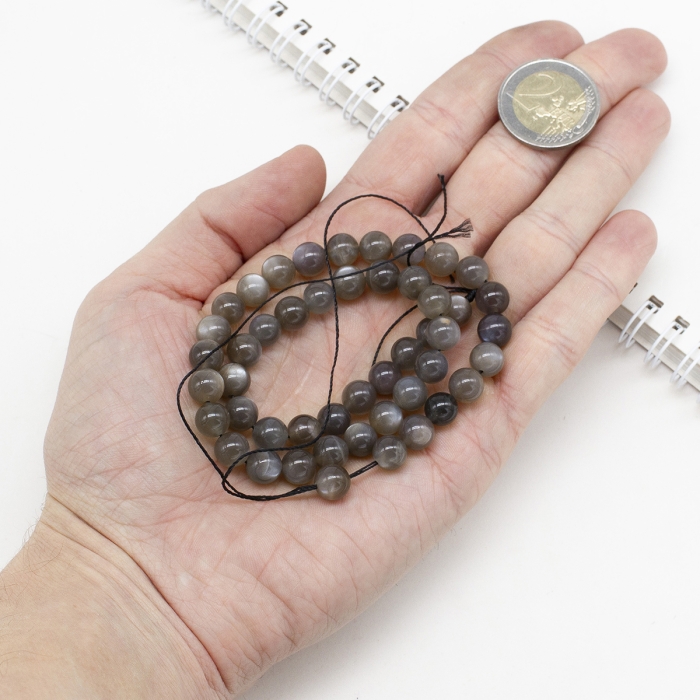 Круглые бусины из чёрного лунного камня идеально подходят для создания браслетов, ожерелий, серег и подвесок. Их естественный цвет и уникальное свечение прекрасно сочетаются с другими натуральными камнями, металлом и кожаными элементами, что позволяет создавать многослойные и выразительные изделия. Лунный камень особенно популярен в украшениях в стиле бохо и этническом стиле, добавляя изделиям загадочность и природное очарование.