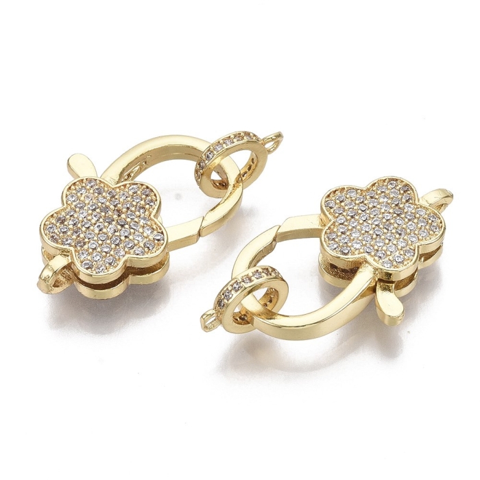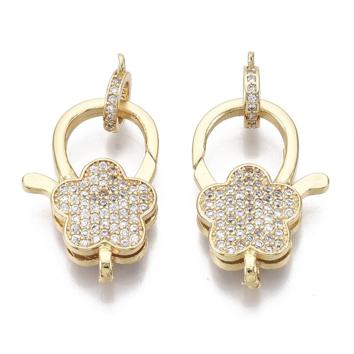 Застежка Карабин-Лобстер, Латунь с Фианитами, с Кольцом, Цветок, Покрытие Золото 16К, 24х16х5мм, Отверстие 1.5х2мм, (УТ100026788) - ᐈ заказывайте в Москве оптом и в розницу ✅Скидки ✅Акции ✅Распродажи ᐈ доставка по всей России ᐈ Интернет-магазин Мир Бусин