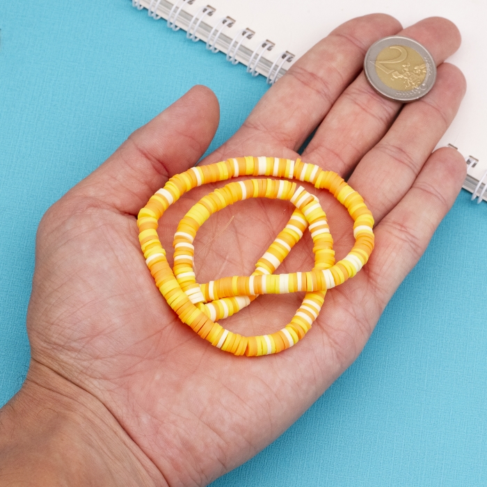 Плоские круглые бусины heishi ручной работы из полимерной глины - это отличный выбор для создания легких, летних или пляжных украшений, а также для детской бижутерии. Они могут быть использованы для создания ожерелий, браслетов, сережек и других украшений, добавив вашему образу нотку непринужденности и веселья. Эти бусины также можно комбинировать с металлическими украшениями и жемчугом, создавая уникальные комбинации. Хотя бусины могут немного отличаться по форме и размеру, именно это делает каждое изделие уникальным и особенным.