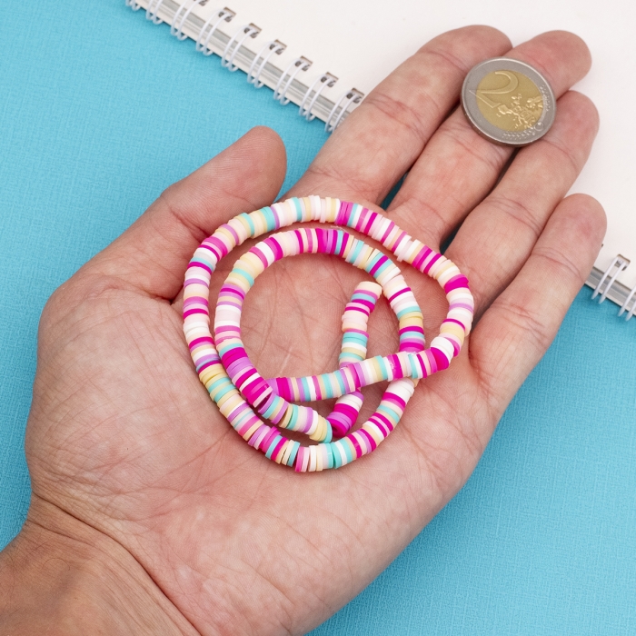 Плоские круглые бусины heishi ручной работы из полимерной глины - это отличный выбор для создания легких, летних или пляжных украшений, а также для детской бижутерии. Они могут быть использованы для создания ожерелий, браслетов, сережек и других украшений, добавив вашему образу нотку непринужденности и веселья. Эти бусины также можно комбинировать с металлическими украшениями и жемчугом, создавая уникальные комбинации. Хотя бусины могут немного отличаться по форме и размеру, именно это делает каждое изделие уникальным и особенным.